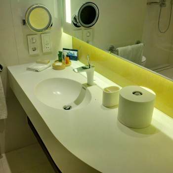 The bathroom looked a little ‘plasticy’ but still looked good because the hotel had just opened. It may lose its appeal over time. Toiletries were the standard ‘Roth’ in-house Hilton brand. It only had a shower, not a bath.
