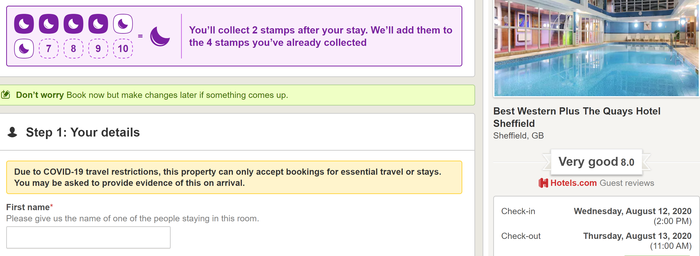 You’ll collect two stamps instead of one for each night you stay which will be credited to your account after you check out. The top of the screen confirms it (note that this is a one-night booking which earns two stamps, and that my ability to get a refund on my payment is confirmed) – click to enlarge: