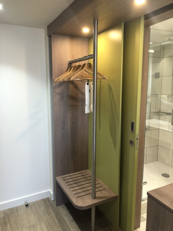 The ‘wardrobe’ is what you come to expect from low cost hotels these days, ie an open rail. The coathangers are ‘proper’ ones and not the silly ‘unstealable’ ones I had to contend with at Holiday Inn Bournemouth.