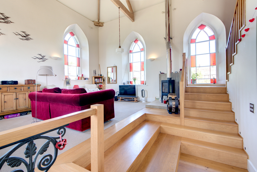 The open plan kitchen leads onto a raised dining and lounge area, all floodlit by the red stained-glass windows. Guests will benefit from a wraparound garden, and a short stroll to two excellent local pubs.