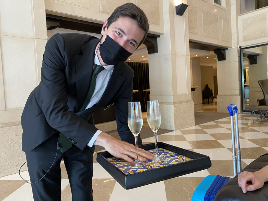 After staying at the Moxy Lisbon City for two nights the Ritz Carlton is refreshingly luxurious. On check-in we were greeted with two glasses of was probably Portuguese sparkling wine and told to take a seat whilst othe paperwork was taken care of:
